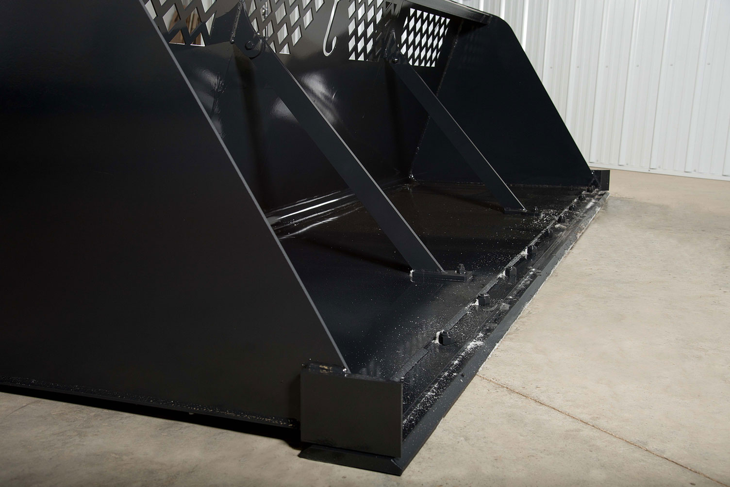 Our Snow & Material Buckets come standard with ¾” by 8” hardened, reversible bolt-on cutting edges for easy replacement and significantly increased wear, as well as curb guard cutting edges to protect the sides of the buckets. All of our Snow Buckets also feature ½” by 2 ½” under strapping throughout the bottom of the bucket significantly increasing the rigidity and life of the bucket.